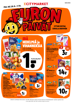 HINNAT VOIMASSA MA-KE 29.9.–1.10.2025, ellei toisin mainita. Hinnat voimassa vain kotitalouksille. Tuotteita rajoitetut erät. Priserna gäller MÅN.–ONS. 29.9–1.10.2025, ifall inget annat nämns.