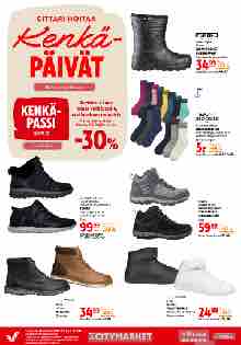 Keräämällä kuusi leimaa Kenkäpassiin saat kuudennesta parista -30% alennuksen. Saat yhden leiman ostaessasi yli 10 € maksavan kenkäparin. Alennuksen saa myös tarjousjalkineista. Kenkäpassi on voimassa kaikissa K-Citymarketeissa 1 vuoden ensimmäisestä leimasta.