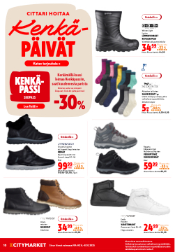 Keräämällä kuusi leimaa Kenkäpassiin saat kuudennesta parista -30% alennuksen. Saat yhden leiman ostaessasi yli 10 € maksavan kenkäparin. Alennuksen saa myös tarjousjalkineista. Kenkäpassi on voimassa kaikissa K-Citymarketeissa 1 vuoden ensimmäisestä leimasta.