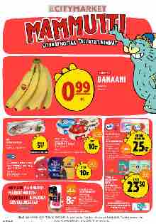 099 KG BANAANI Kolumbia Bananer            ERÄ TUORE KIRJOLOHI Suomi Rajoitus 2 kpl/talous Valio Daim, Oreo ja - HINTAAN 5 99 KG Ingman Creamy JÄÄTELÖT 825–850 ml (3,92–4,04/l) Glass Ilman Plussa-korttia 5,19–5,75/pkt (6,11-6,97/l) -51 % 3 PKT 10. -38 % Ilman Plussa-korttia wc-paperi 22,95/säkki (0,57/rl), talouspaperi 14,25-17,55/säkki (0,71-0,88/rl) -35–42 % WC-PAPERI 40 rl Soft Embo Emilia TALOUSPAPERI 20 rl Puoli- tai kokoarkki valkoinen jopa YHTEIS- Valkoinen. 0,38/rl ja 25.-   VOIMASSA TO-LA 16.–18.10. tai Design. 0,50/rl Toalettpapper och hushållspapper         SALANEUVOS, POLAR ja EDAM JUUSTOVIIPALEET 270–300 g (11,11–12,35/kg) Ostskivor Ilman Plussa-korttia 4,29/pkt (14,30–15,89/kg) AKTIVOI MAMMUTTI- MARKKINOIDEN MOBIILIETU K-RUOKA -SOVELLUKSESSA --22 % 3 PKT 10. -34 % 3 PKT 23     Kulta Katriina JAUHETUT KAHVIT 450–500 g TEIPPI- ja HOUSUVAIPAT KOOT 3–8 26–54 kpl/pkt Rajoitus 2 erää/talous. 0,15–0,30/kpl Tejp- och byxblöjor Ilman Plussa-korttia 9,95-11,95/pkt (0,18-0,44/kpl) Pampers 50 jopa     42LV/2025 OSA 3 HINNAT VOIMASSA TO-SU 16.–19.10.2025, ellei toisin mainita. Tarjoukset voimassa vain kotitalouksille. Tuotteita rajoitetut erät. Erbjudandena gäller TORS.–SÖN. 16–19.10.2025, ifall inget annat nämns. Lue lisää » Ilman aktivointia ja Plussa-korttia 8,19/pkt (16,38–18,20/kg) Mobiilietu voimassa vain K-Citymarketissa 13.–19.10.2025. SENSITIVE PUHDISTUSPYYHE 52 kpl ja HARMONIE PUHDISTUS- PYYHKEET 44–48 kpl -15% - 8. Ei Plus eikä Reilu (8,00–8,89/kg) Rajoitus 1 erä/asiakas Malet kaffe 2 PKT Plussa-kortilla CITTARI HOITAA TALLATUT HINNAT