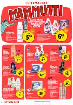 KATSO KAIKKI KÄYTTÖTAVARAN TARJOUKSET Ostoksille »         ANTIPERSPIRANTTI ROLL-ONIT ja SPRAYT 50–150 ml 18,33–55,00/l antiperspiranter, roll-on och spray Ilman Plussa-korttia 3,99-4,29/kpl (26,60-28,60/l) 5 2 KPL 50 PYYKINPESUNESTEET 2,2 l tai PYYKINPESUKAPSELIT 22 kpl/pkt 2,95/l, 0,30/kpl jopa -35% 6 jopa flytande tvättmedel eller tvättkapslar Ilman Plussa-korttia 8,29-10,40/kpl (4,61-4,73/l, 0,38/kpl) -37 % 49 KPL          Elvital  SHAMPOOT, HOITOAINEET ja HIUSNAAMIOT 300–400 ml 8,13–10,83/l Schampon, balsam och hårmasker Ilman Plussa-korttia 4,49-6,29/kpl (11,23-20,97/l) Fila SUIHKUGEELIT 250 ml ja DEO VARTALOSPRAYT 150 ml 9,00–15,00/l Duschgeler och deo- kroppssprayer Ilman Plussa-korttia 3,45-3,65/kpl (13,80-24,60/l) DEO ja ANTIPERSPIRANTTI ROLL-ONIT 50 ml, SUIHKU- SAIPPUA 250 ml ja NESTE- SAIPPUA 300 ml 8,33–50,00/l Roll-on och deo antiperspiranter, duschtvål och flytande tvål Ilman Plussa-korttia 3,15-3,79/kpl (10,49-73,00/) 4 PUHDISTUS- SUIHKEET 750 ml Max Pro  STICK ja SPRAY ANTIPERSPIRANTIT -63 % jopa    jopa AINEET 500 ml ja PUHDISTUS- jopa 45-150 ml 9 -48% -33% 2KPL  2 KPL 50 4 4 -10% 80 PKT -11% 30 PKT 50 6 Ilman Plussa-korttia 3,15-3,39/kpl (4,52-6,30/l) just1 TALOUSPAPERI 6 rl 0,80/rl Hushållspapper Ilman Plussa-korttia 5,39/pkt (0,90/rl) Ilman Plussa-korttia 13,30-13,45/kpl (295,55-298,88/l) Axe ROLL-ONIT 50 ml, BODYSPRAYT 150 ml ja SUIHKUGEELIT 250–400 ml 8,33–66,60/l Roll-on deodoranter, bodysprayer och duschtvål Ilman Plussa-korttia 3,65-6,25/kpl (12,47-111,00/l) WELLAFLEX, WELLA DELUXE ja SHOCKWAVES HIUSTENMUOTOILU- TUOTTEET sekä CLAIROL HIUSVÄRIT Wellaflex, Wella Deluxe och Shockwaves stylingprodukter samt Clairol hårfärger Esim. Wellaflex 2 Days Volume HIUSKIINNE 250 ml 16,04/l Ilman Plussa-korttia 5,35 (21,40/l) 3,00–4,50/l Rengöringssprayer och rengöringsmedel 33,13–110,44/l 95 2 KPL antiperspiranter, stick och spray         jopa -46 % -39 % jopa    2 KPL 50 4 3 KPL 10. -      -25%        2 KPL just1 WC-PAPERI 12 rl 0,69/rl Toalettpapper Ilman Plussa-korttia 9,35/pkt (0,78/rl) 8 - 5. 4,01 jopa -34 % Alennukset normaalihintaisista tuotteista. Valikoimat ja saatavuus vaihtelevat myymälöittäin.